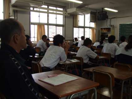 10月15日(木)、1限目の英語です。2年3組で住友先生と、崎山先生が複数で授業を進めています。非常にわかりやすい授業が展開されています。今日は他に宮岡先生の国語の授業も割り当てられていますので、この後参観に行きます。授業力の向上を目指しています。