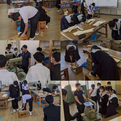 【技術】本棚を作っています。のこぎりややすりを使って木を加工します。電動のこぎりやボール盤の使い方を聞きます。(1組)