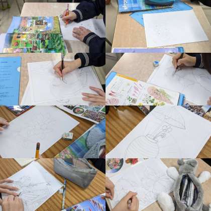 【美術】ちぎり絵の下書きをしています。テーマは「和」です。(2組)