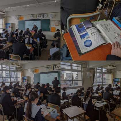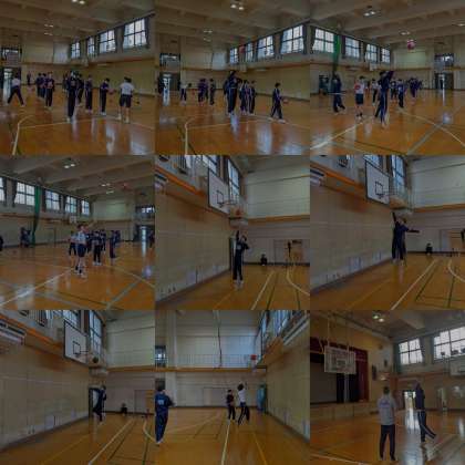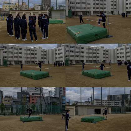 【体育】男子は体育館でバスケットボール、女子は運動場で走り高跳びをしています。(1、3組)