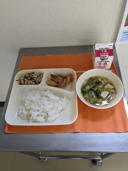 【本日の献立】 鶏肉の甘みそ焼き 五目汁 高野どうふのいり煮 ごはん 牛乳