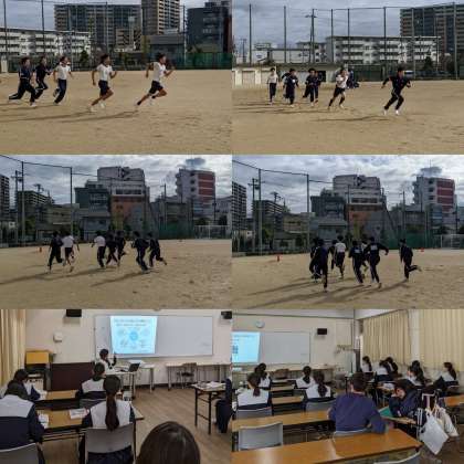 【体育】男子は長距離走の練習でインターバル走をしています。女子はスポーツの文化的意義について学んでます。(2組)