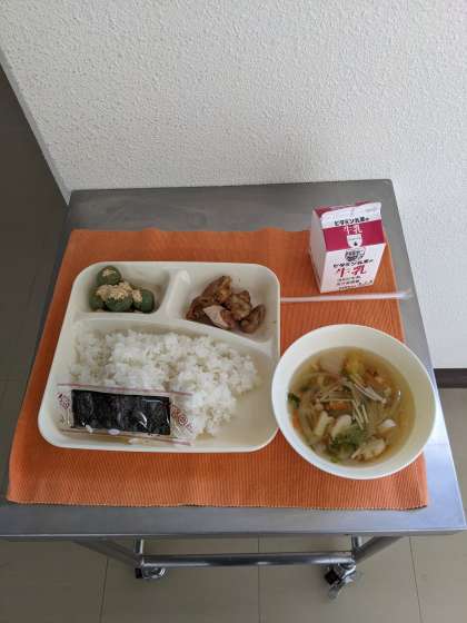 【本日の献立】 鶏肉のみそバターソース 五目汁 きな粉よもぎだんご 焼きのり ごはん 牛乳
