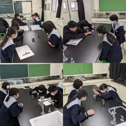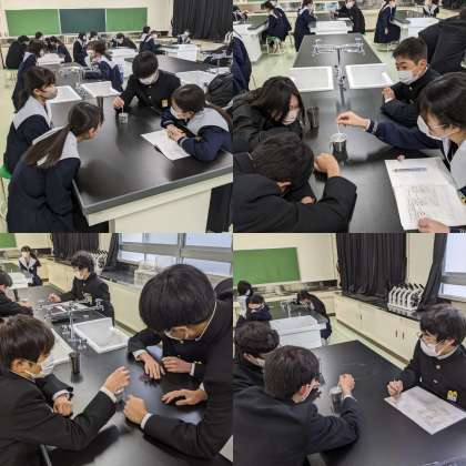 1時間目の授業の様子です。理科の授業で、空気中の水蒸気の推定実験をしています。教室の空気の露点は何度かを考察します。