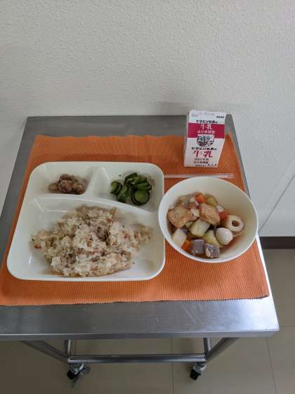 【本日の献立】 関東煮 きゅうりの梅風味 とら豆の煮もの かやくご飯 牛乳