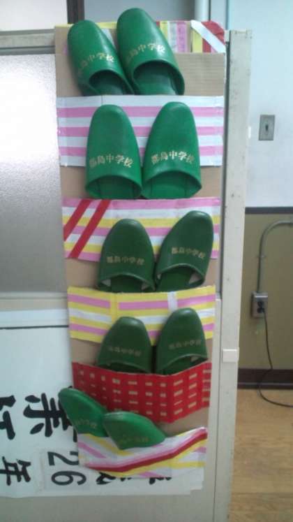 11月17日(火)南館1Fの小会議室のスリッパたてをニーズルームの生徒が段ボールの空き箱を使ってスリッパたてを作ってくれました。カラフルなテープで飾られた手作りのスリッパたてです。