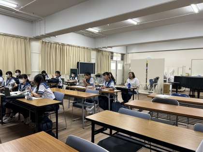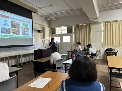 ユニクロから講師を招いて、SDGsに関連したさまざまな持続可能な社会をめざした活動を教えていただきました。ユニセフの活動など地球市民としての考え方を教わりました。