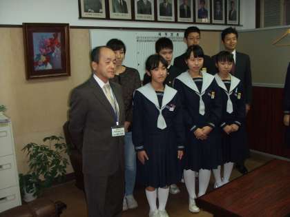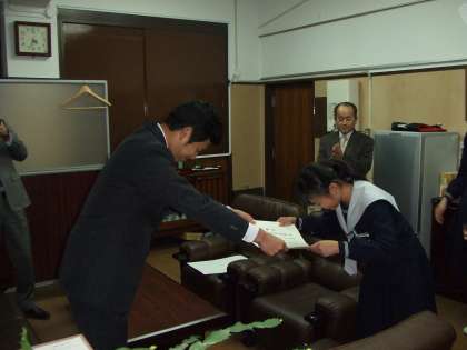 昨日の夕刻、4時30分に都島区長の田畑龍生様がお越しになり、生徒会・英語部が過日行ったネパールの震災に対する支援としての募金活動に、感謝状をいただきました。