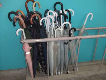 南館2階の相談室前に傘がたくさん集められています。持ち主が現れないままになっています。昨日のようなときに、貸し出しとして、傘がない人につかってもらっていますが、今一度、自分の傘がないか探してみてください。