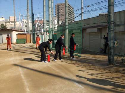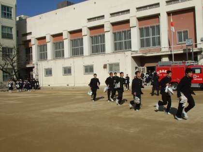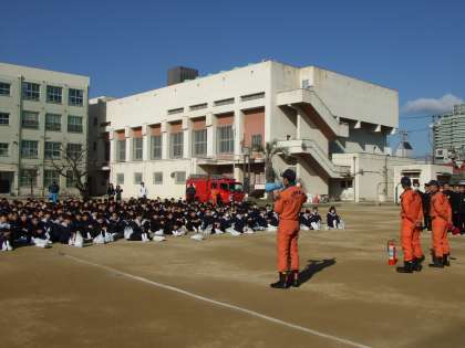 土曜授業として、火災を想定した避難訓練を実施しました。明日の17日は21年前の阪神淡路大震災が起きた日です。震災の後は、大火災になり、中でも神戸の街は焼け野原になりました。火災から身を守るため、都島消防署員の方々にもご指導をいただきました。初期消火として、消火器の使い方を代表の人に体験してもらいました。