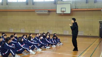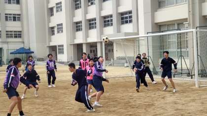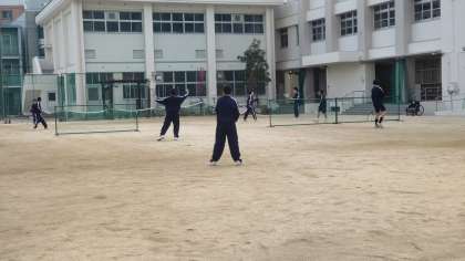 体育館とグランドに分かれて体育をしていました。生徒アンケートで、体育の授業の肯定的回答は非常に高い数値となっています。