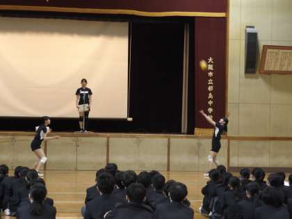 昨日(4月10日)に2,3年生による部活動紹介が実演も交えて行われました。1年生も興味深く熱心に見入っていました。今日(4月11日)から17日まで1年生は仮入部期間で、17時まで見学・体験できます。部活動の入部考えている場合には、様々な部活動を体験して自分に合う部活動を探しましょう。
