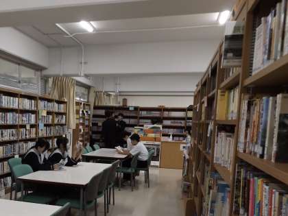本日は雨の影響もあり、図書室に多くの生徒が集まっていました。本校には1万を超える図書があり、小説、随筆、物語、大型本、漫画など、多くの種類の本があります。どの本を読もうか悩む生徒もいれば、シリーズ物の続きをすぐに借りる生徒もいて、思い思いの時間を過ごしていました。