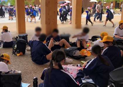 一年生は万博へ遠足に行きました。晴天にも恵まれ充分活動を楽しみました。到着してすぐにお弁当を食べ、その後は班に分かれて事前に計画していたパビリオンなどを回りました。