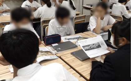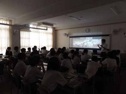 本日の1年生の美術の授業では、総合教育センターの研修の一環として、研究授業を行いました。ラスコーの洞窟壁画を題材にどのようなことが描かれているのか、各自で考えたり、グループで考えたりして、絵画鑑賞を行いました。壁画の細かい部分も着目した様々な発想や考えを発表しました。