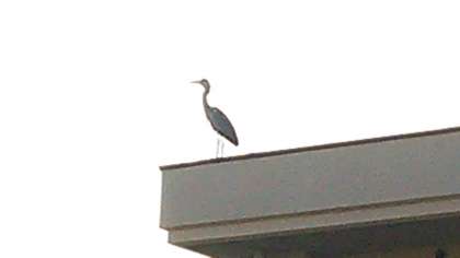 3月30日(水)朝、まだだれもいない無人の学校にサギが表れました。池の鯉を狙っています。