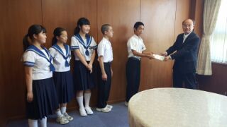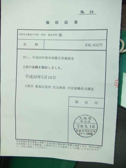 5月18日(水)午後4時、都島区役所に生徒会とボランティア部の生徒が林田区長に直接受け取ってもらいました。金額は36,635円です。