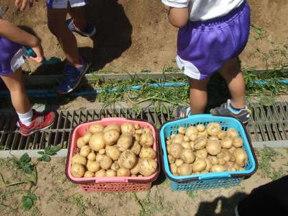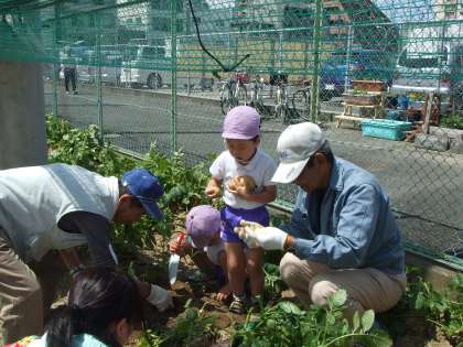 都島桜宮保育園の子どもたちが第2グランドへ集まってきました。元気アップ事業の一環として、地域のボランティアの方々が育てたジャガイモが、育ってきたので、芋ほりを体験してもらっています。かごいっぱいにとれました。