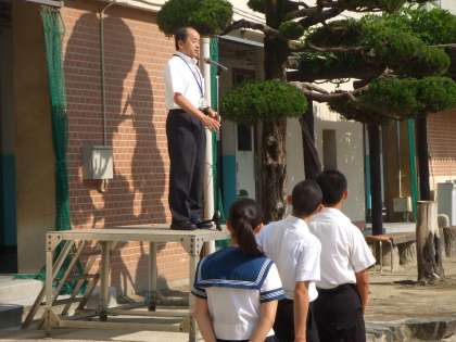 朝から気温が上昇している暑い中、集会です。短く話をしました。今週末の期末テストを頑張ること。そして次の土曜日7月2日に区民センターで「都島区高校進学フェア」が開催されること。これは、都島区PTA協議会が主催で、時間は午後1時から4時です。部活動の行き帰りも含めて、ぜひ多くの皆さんに行ってくれることをお願いします。