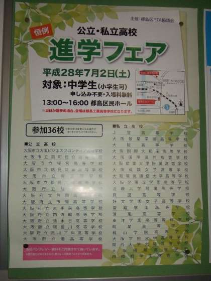 明日の7月2日土曜日に、都島区民ホールにて開催されます。時間は午後1時〜4時です。たくさんの公立高校、私立高校がブースを作って説明してもらえます。保護者の方だけでも構いませんし、生徒だけでも構いません。もちろん、保護者同伴でもOKです。