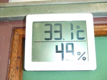 教室内の温度計は33度を越えています。