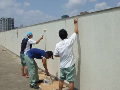 炎天下のもと、管理作業員さんと事務職員さんが3人で、2学期の水泳授業に備えて、塗装作業をしてくれています。影がなく、太陽光線がじりじり照りつける中での作業、汗だくです。ご苦労様です。ありがとうございます。