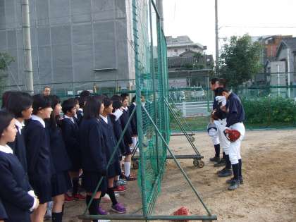 左の写真は、卓球部の練習風景を見学しているところです。右は第2グランドで活動している野球部の代表部員から説明を聞いています。