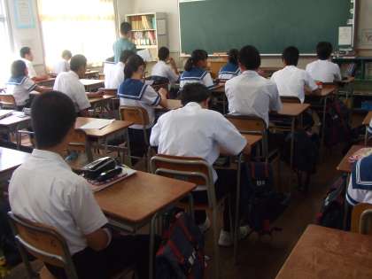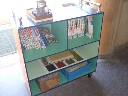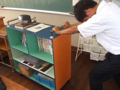 写真は3年生の美術の様子です。教室で授業をしています。本来ならば用具・道具類がそろっている美術室で授業を展開したいのですが、西館の3階に位置し、エアコンがなく、この夏場の室内温度は半端ではありません。仕方なく教室で授業をする羽目になりました。そこで、資料や工具・道具類が速やかに運べるよう写真の立派なワゴン車を管理作業員さんの手作りで作ってもらいました。ワゴン車の中には教材がぎっしり、かなりの重さです。しかし、ワゴン車はびくともしません。立派なワゴン車を作って頂き、涼しい教室での授業にも気合が入ります。
