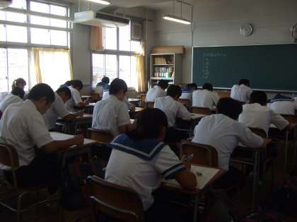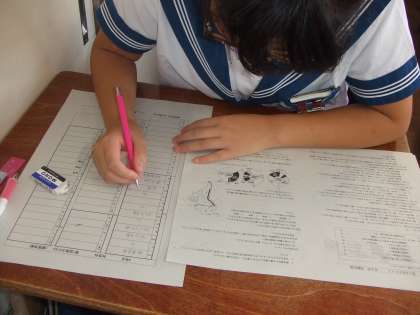 1時間目の社会を必死で解答しています。夏休みに勉強していたかどうかで結果が大きく左右されます。2学期からは、毎月1回実力テストが実施されます。その成績を基に受験校の相談がされます。今からでも遅くない! 頑張れ3年生!!