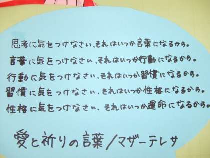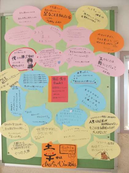 職員室前の掲示板に図書委員が本から選んだ名言集が掲示されました。どれも心にしみる素晴らしい言葉です。ぜひ職員室前の掲示板を見てください。