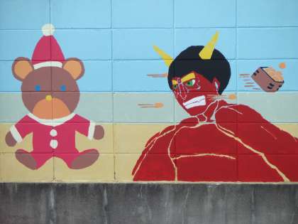 10月19日(水)学校の北側の壁画が新しく追加されました。先週の15日(土)、土曜授業の午後に美術部の人たちが新しく壁画を描いてくれました。楽しい壁画です。散歩中の人達、通勤通学の人達、そして、環状線に乗っている人たちを楽しませてくれます。美術部の皆さん、楽しい壁画ありがとう。