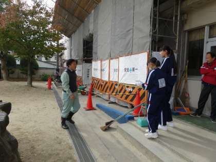 11月10日(木)、1日目です。写真は都島小学校で管理作業員さんと一緒に仕事をしている風景です。