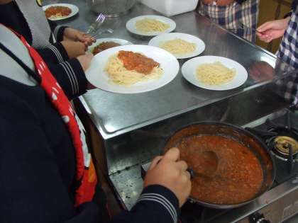 11月15日(火)の3・4限です。家庭科の時間です。2年4組がスパゲッティを作っています。おいしそうなできばえです。