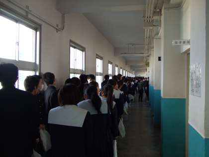 上の写真は校舎へかけていく1年生(手前)と3年生(奥)です。下の写真は4階へ避難し、廊下に整列する3年生の様子です。
