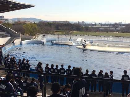 1月27日(金)京都水族館でのイルカショーの後、お弁当を食べています。なななんと・・イルカが都島中学校のみんなに挨拶をしてくれているではありませんか。最高!!少し暖かく、天気も良く、お弁当はバツグンにおいしいです。