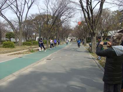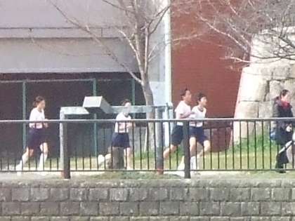 写真は上から順に、大川の向こう岸を駆け抜けています。ゴールでは保護者の方々も応援に来てくれています。1年生の1位の生徒です。