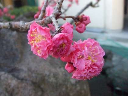 池のほとりの梅の木と玄関の花壇の花です。暖かくなってきて、きれいな花が咲いています。