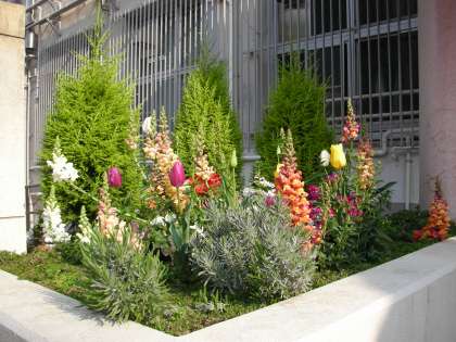 正門玄関の花壇に美しいお花が咲いています。ボランティア部の皆さんが球根や苗を植え、育てたものです。気温が高くなってきたので、一気に咲いてきたようです。赤、黄、白、ピンクと色とりどりです。きれいな花を見ていると、心が穏やかになってきます。