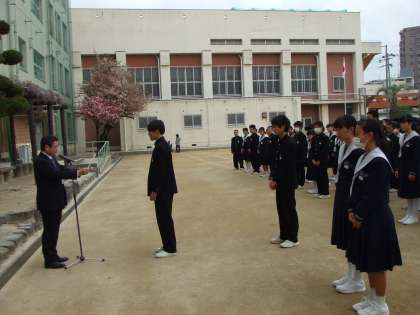 集会の最後に、表彰状の伝達を行いました。硬式テニス部の表彰です。大阪市春季総合体育大会個人予選男子の部で、『優勝』『準優勝』、女子ダブルスの部で『第3位』を獲得しました。おめでとうございます!