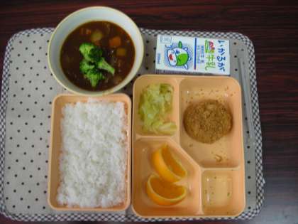 本日は、ビーフシチュー、ブロッコリー、ミンチカツ、キャベツピクルス、清美オレンジです。ブロッコリーは、最初にビーフシチューの上に添えて、彩よくします。