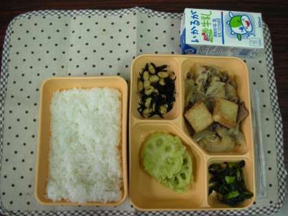 本日は、すき焼き煮、れんこんの若草揚げ、大豆とひじきの煮物、小松菜のおひたしでした。すき焼き煮は、おそらく生徒の皆さんもおいしくいただいたのではないでしょうか。れんこんの若草揚げは、味がうすく、しかも油ものが冷えた状態で提供されているので、「冷たいのがちょっと」と、表現している人が何人かいました。