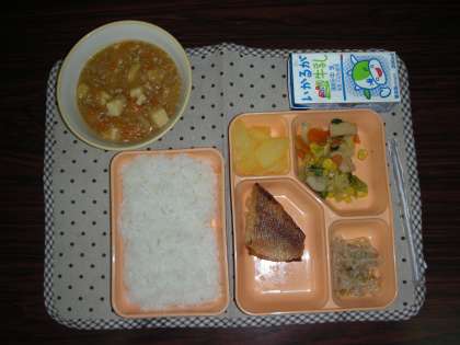 本日は、マーボー豆腐、赤魚の中華焼き、いかとチンゲンサイの炒め物、もやしのピリ辛あえ、りんご缶詰でした。