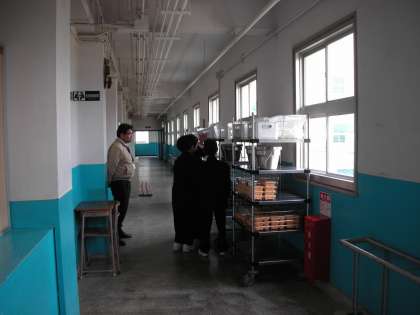 給食の準備をするときには、教頭先生と学年の先生が配膳室の前で、食器類のかごを忘れることなく当番の人が持っていくかどうか、確認しています。多くの人が給食の取組に関わっています。