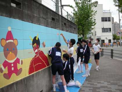 本校の北側にブロック塀に、美術部が大きなアート作品を描いています。今日と明日の2日間、続きを描いています。土筆(つくし)、鯉のぼり、桜の花びら、藤の花など、季節感あふれる作品です。