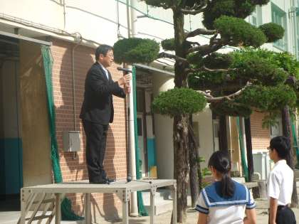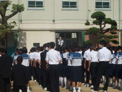 5月8日(月)全校集会を行いました。連休明けですが8:25には生徒会長の号令で全員が集合しています。一番上の意写真。