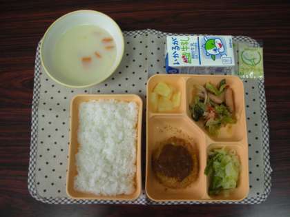 家庭訪問と大型連休が終わり、久々のお昼御飯です。本日の給食は、チキンカツ、ウインナーと野菜のソテー、キャベツとアスパラガスのサラダ、パインアップルの缶詰、ポタージュスープです。サラダには、ドレッシングが添えられています。