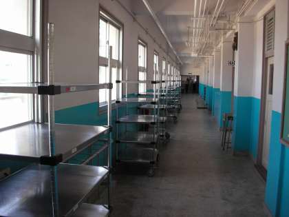 昼食時間の配膳室前の給食用のワゴンです。当然ですが、台の上には何もありません。
