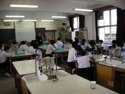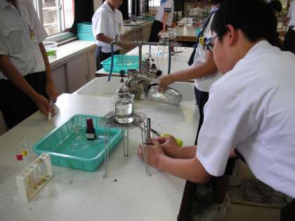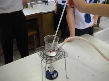 まず、ビーカーに水を入れ、人の体温と同じくらいの温度にするために、ガスバーナーを使って約40度のぬるま湯にしました。ガスバーナーの使い方は、1年生のときのことを思い出しながら火をつけています。
