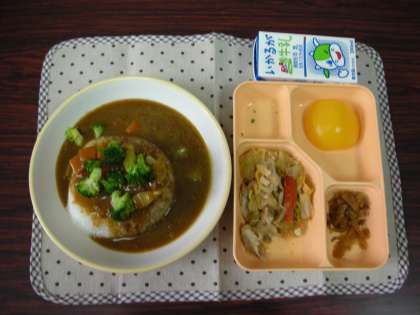 ミートカレーライス、ブロッコリー、豚肉と野菜のバーベキューソース炒め、福神漬け、桜桃缶詰です。