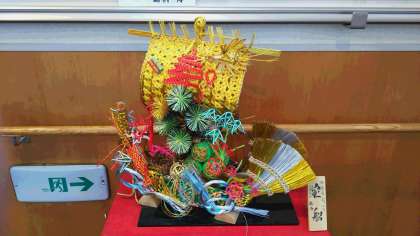 昼食後、水引会館を見学しています。写真は宝船ですがすべて水引でできています。